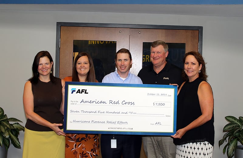 Spartanburg, SC – AFL, a leading global fiber optic cable and accessories manufacturer, presented a $7,500 check to the American Red Cross in support of disaster relief in areas affected by Hurricane Florence. The grant was made possible by AFL associates and AFL’s Community Outreach Program.