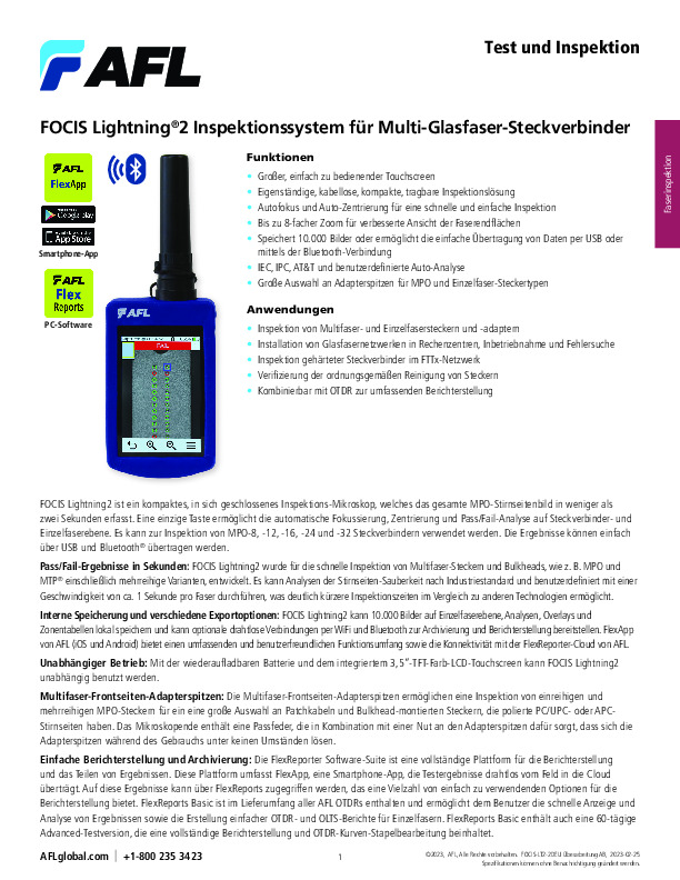 Einfache Berichterstattung und Archivierung: Die FlexReporter-Software-Suite von AFL ist eine vollständige Plattform für die Erstellung von Berichten und die gemeinsame Nutzung von Ergebnissen. Diese Plattform umfasst FlexApp – eine mobile App, die Testergebnisse kabellos vom Einsatzort in die Cloud überträgt. Die Ergebnisse können über FlexReports abgerufen werden, die zahlreiche benutzerfreundliche Optionen zur Berichtserstellung bieten. FlexReports Basic ist im Lieferumfang des FOCIS Lightning2 enthalten und ermöglicht eine schnelle Anzeige, Analyse und Erstellung von Berichten. Eine 60-tägige Testversion von FlexReports Advanced mit erweiterten Berichtsfunktionen ist ebenfalls enthalten.