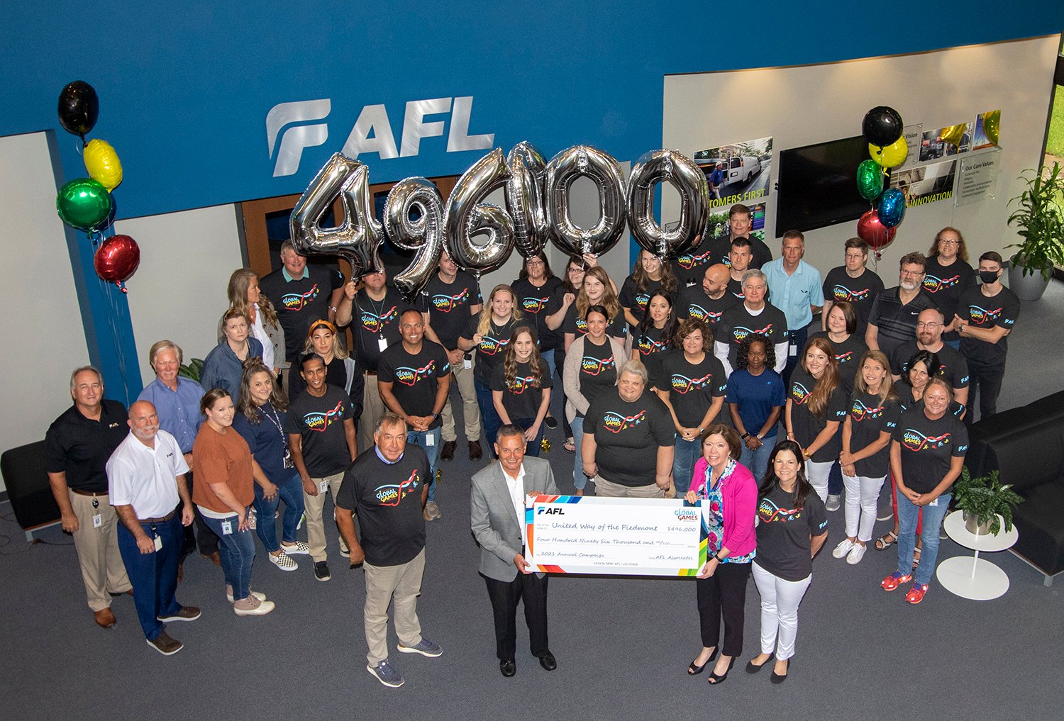 Spartanburg, SC – AFL, an international manufacturer of fiber optic cable, connectivity and accessories, completed its annual United Way campaign by presenting $496,000 to United Way of the Piedmont. The donation was made possible by AFL associates and AFL’s matching program which matches all donations up to $100.