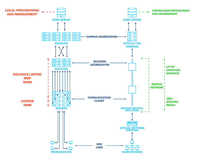 When compared against legacy, copper laden architectures, Passive Optical LAN networks reduce complexity by flattening the LAN and simplify network moves, adds and changes. Plus, POLANs are not limited by the bandwidth or distance constraints of copper. It does this by utilizing three core building blocks; the Optical Line Terminal (OLT), the Passive Optical Splitter and the Optical Network Terminal.